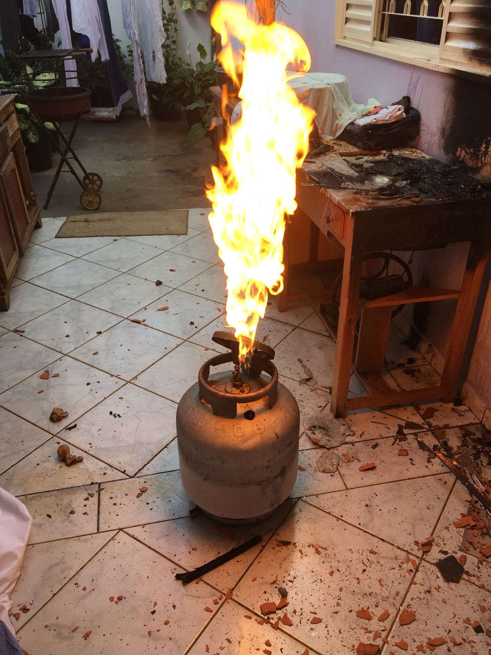 Incêndio no gás de cozinha foi iniciado devido ao aquecimento da válvula de alívio ter se rompido, liberando gás e provocando as chamas. (Foto: Corpo de Bombeiros).
