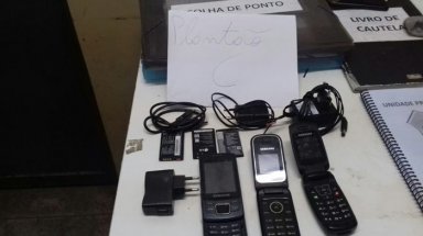Foram apreendidos três aparelhos telefones celulares com baterias e carregadores. (Foto: Reprodução).