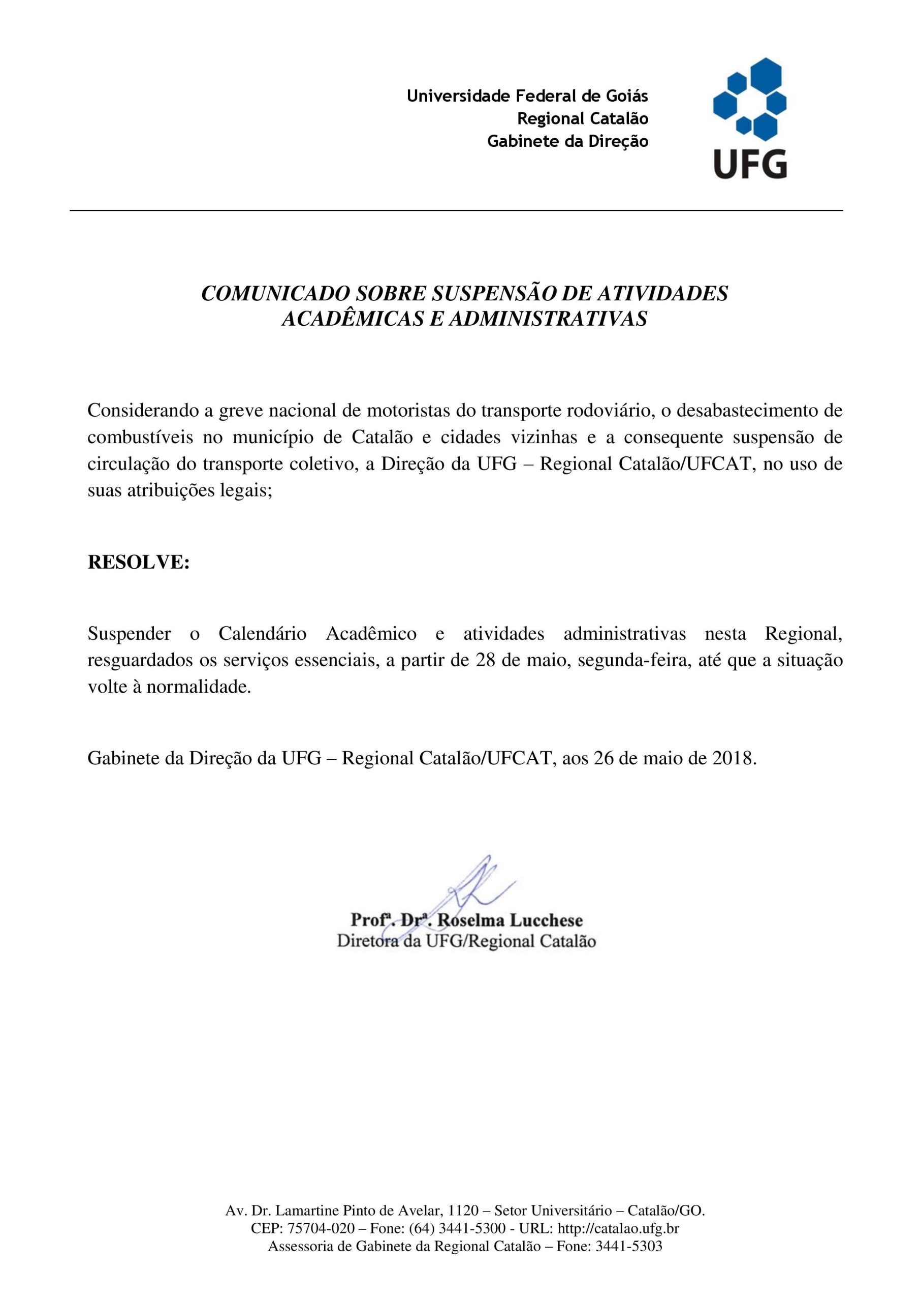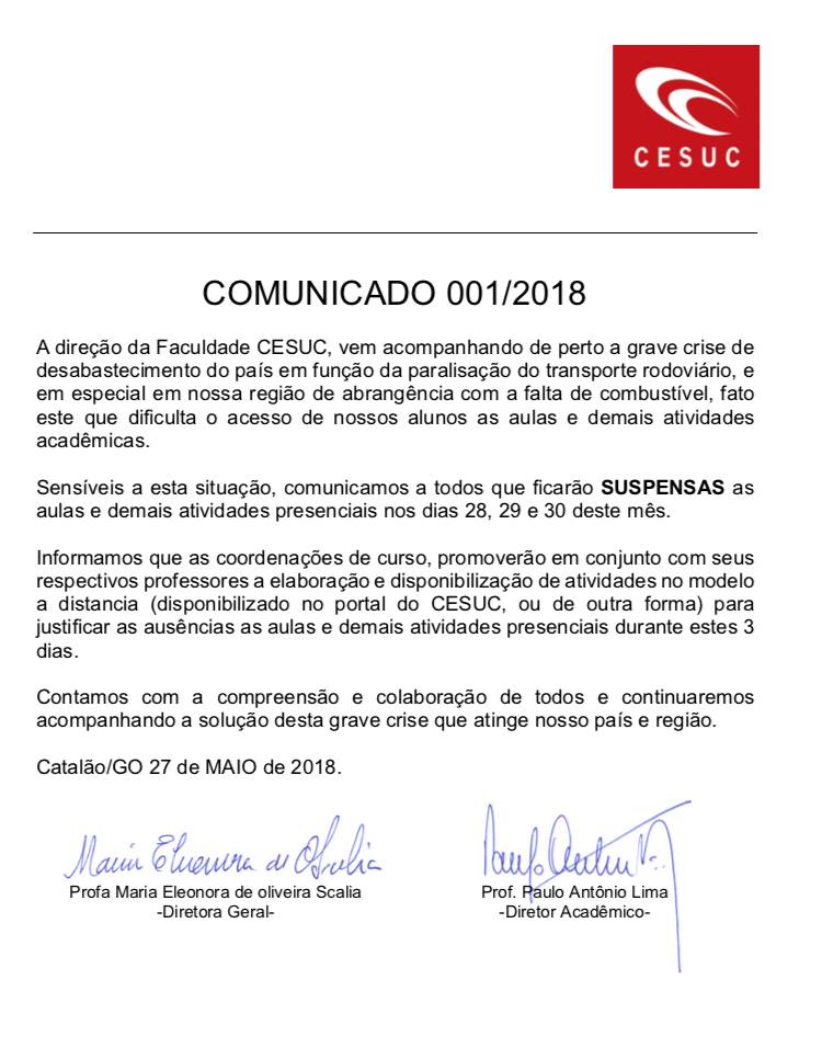 As três principais Universidades de Catalão, sendo elas: Centro de Ensino Superior de Catalão (Cesuc), Universidade Federal de Catalão (UFCAT) e a Faculdade UNA, emitiram notas em seus canais oficiais de divulgação, informando as suspensões de suas aulas já nesta segunda-feira (28), por decorrência da greve dos caminhoneiros que completou sete dias neste domingo (27). Leiam os comunicados de cada uma das três universidades de Catalão: