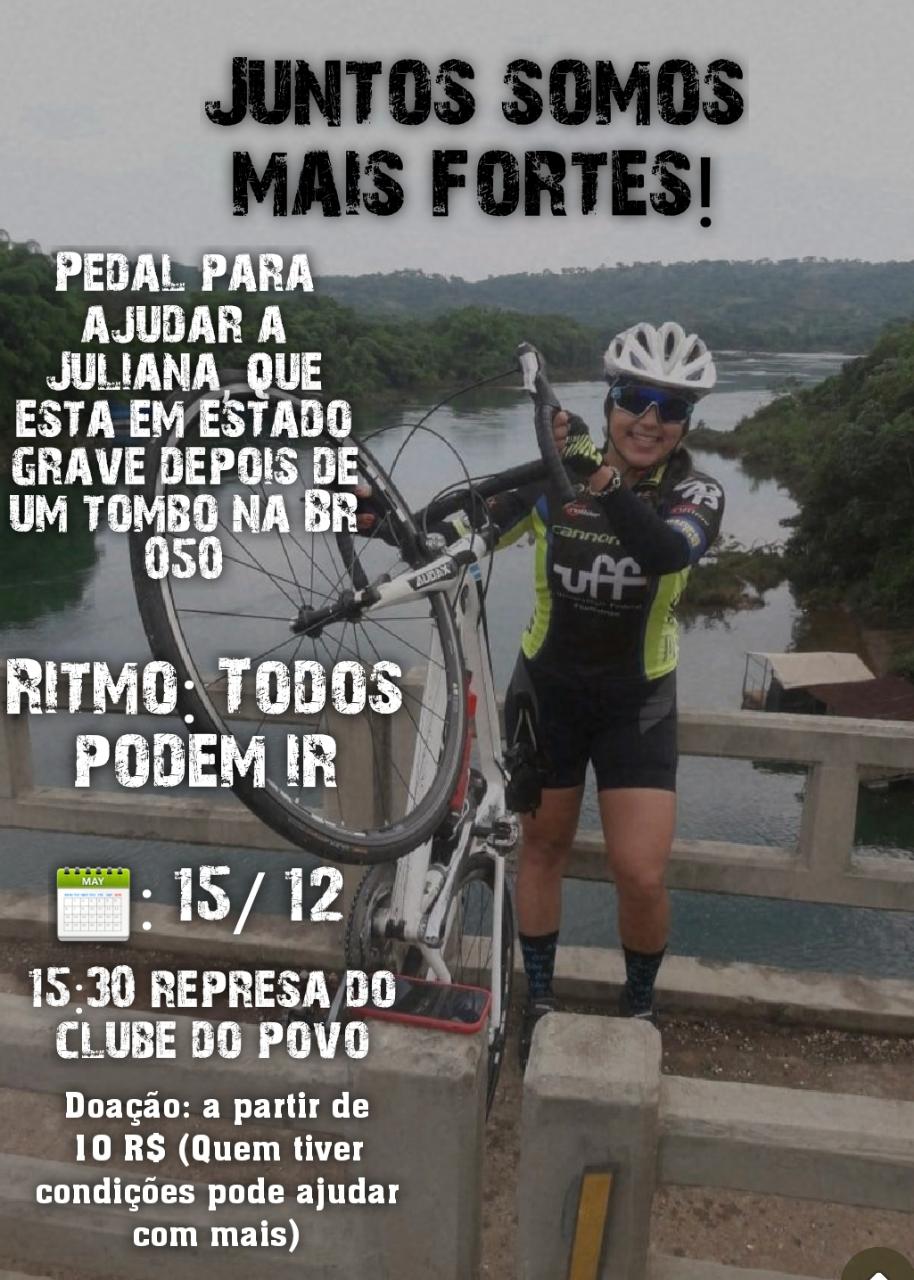 Os milhares de ciclistas estão realizando campanhas para auxiliar a ciclista no seu tratamento, e dois eventos estão programados para acontecer, um deles será hoje, quinta-feira (13), às 19h com saída no Posto Liberdade, saída para Goiandira, onde será realizado um pedal beneficente com arrecadação para destinar ao tratamento de Juliana.