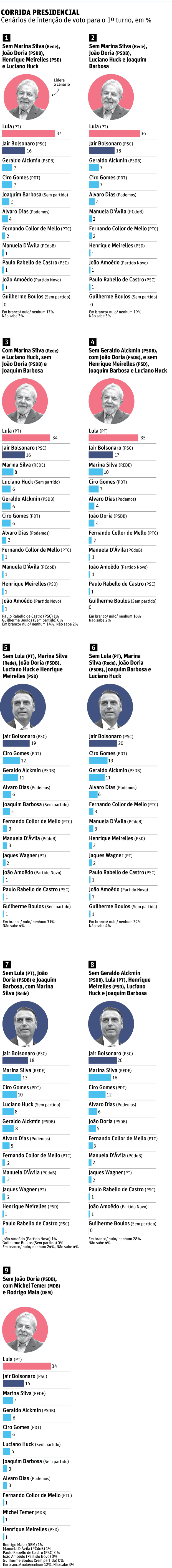 Segundo reportagem da Folha desta quarta-feira, 31 de janeiro, a qual destaca a pesquisa, o eleitorado do petista se pulveriza e a briga tende a se tornar acirrada casa Lula seja barrado com base na Lei da Ficha Limpa.