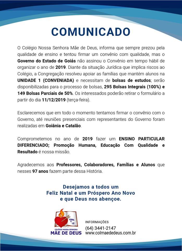 O Colégio Nossa Senhora Mãe de Deus, por meio de um comunicado emitido e publicado em sua página no Facebook, afirmou que o colégio tentou firmar convênio com qualidade, mas o Governo do Estado de Goiás não assinou o convênio em tempo hábil de organizar o ano de 2019.