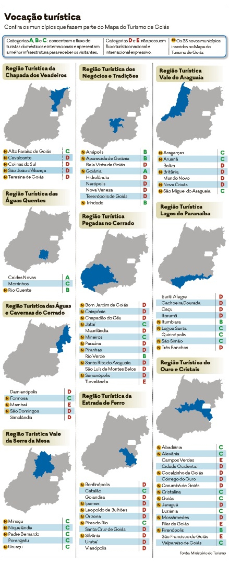 No Mapa do Turismo, os municípios estão agrupados em categorias que vão de A a E a partir de quatro variáveis de desempenho econômico: número de empregos e de estabelecimentos de hospedagem e estimativas de fluxo de turistas domésticos e internacionais e apresentam a melhor infraestrutura para receber os visitantes – 33 municípios goianos, entre os quais Goiânia, Trindade, Caldas Novas, Rio Quente, Alto Paraíso de Goiás, Aruanã, Abadiânia, Formosa, Goiás e Pirenópolis.