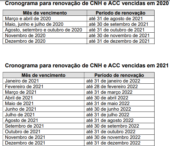 O motorista com a CNH com validade até agosto de 2021, por exemplo, terá até agosto do próximo ano para renová-la. Os cronogramas abrangem CNHs, Permissão Provisória para Dirigir (PPD) e Autorização para Conduzir Veículos Automotores(ACC).