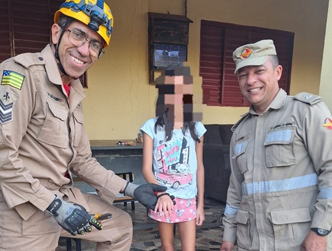 Uma criança de 8 anos prendeu o dedo no cabo de uma panela, e a família pediu ajuda aos bombeiros. A equipe chegou rapidamente com uma viatura e dois militares. Usando uma mini retífica e um alicate, eles cortaram o objeto e libertaram o dedo da criança com segurança.
