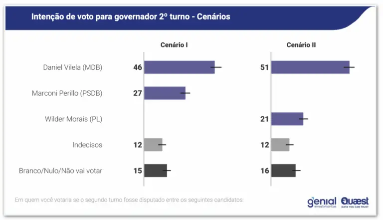 As simulações de segundo turno reforçam o cenário positivo para Daniel Vilela. Contra Marconi Perillo, o governador alcança 46%, contra 27% do adversário — uma diferença de 19 pontos percentuais.