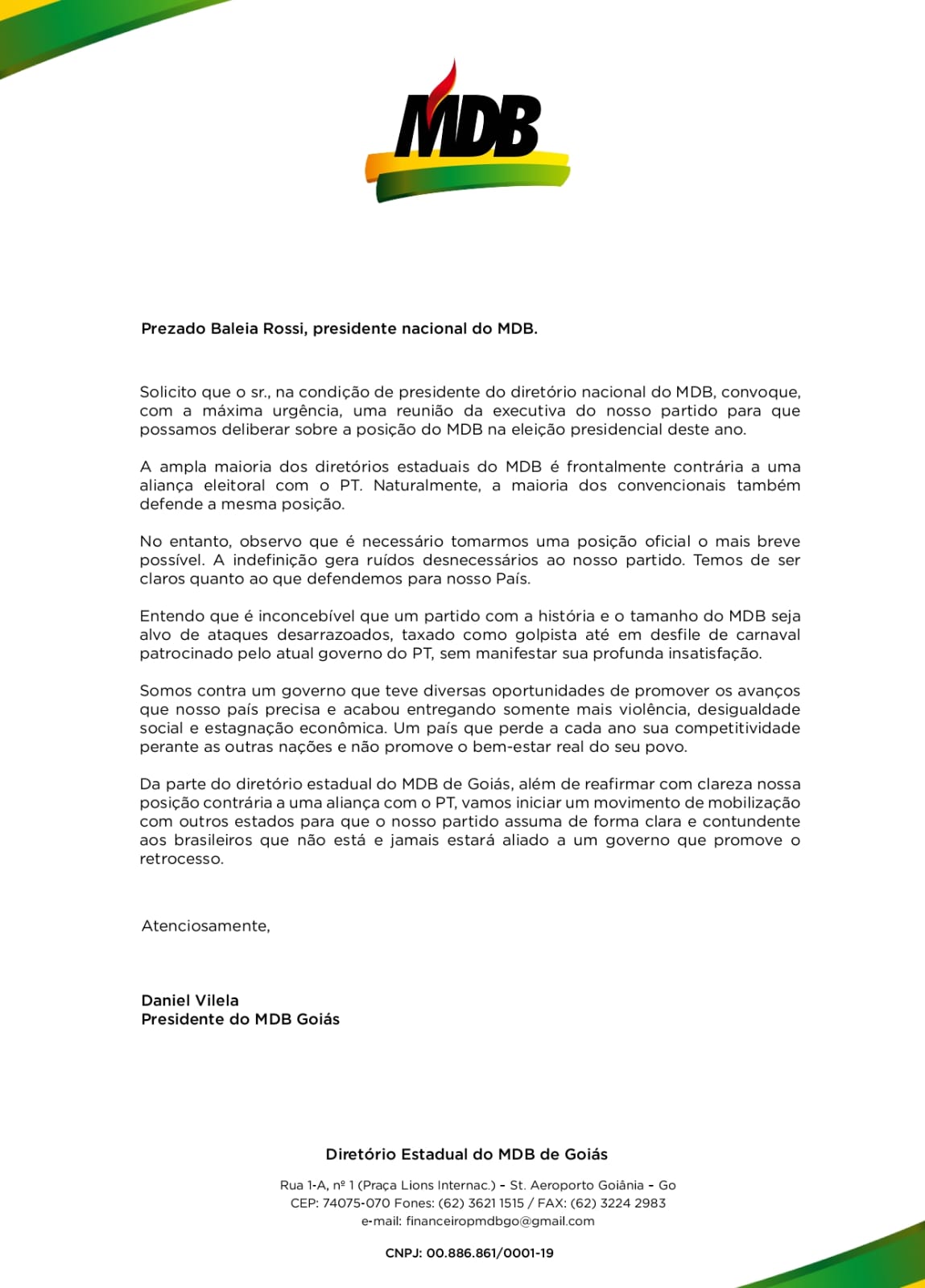 O vice-governador de Goiás e presidente do MDB no estado, Daniel Vilela, iniciou um movimento dentro do partido contra uma possível aliança nacional entre MDB e PT nas eleições presidenciais. Para isso, ele enviou uma carta ao presidente nacional da sigla, o deputado federal Baleia Rossi.