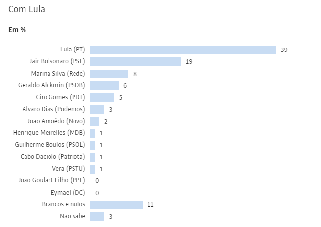 O ex-presidente Luiz Inácio Lula da Silva (PT) aparece liderando a pesquisa com 39% das intenções de voto, mas ele está preso na sede da Polícia Federal em Curitiba-PR, após ter sido condenado por corrupção, e está virtualmente inelegível.