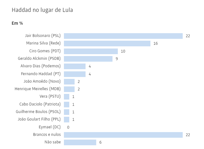 Em um cenário sem Lula, já que o petista foi condenado em segunda instância, se enquadrando na Lei da Ficha Limpa, quem aparece liderando é Jair Bolsonaro (PSL), com 22%.