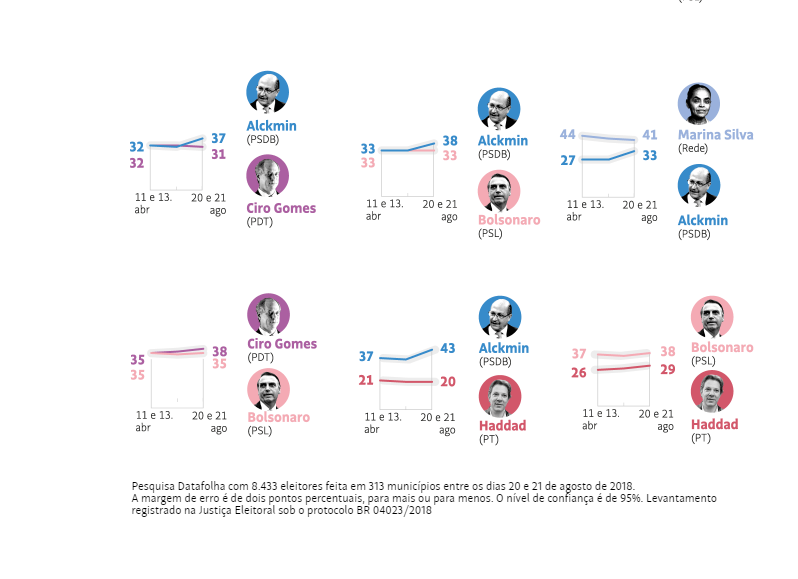 O Datafolha ouviu 8.433 pessoas do dia 20 a 21 de agosto em 313 municípios do Brasil. A margem de erro é dois pontos percentuais para mais ou para menos, e o levantamento foi feito em parceria entre o Jornal Folha de SP e TV Globo.