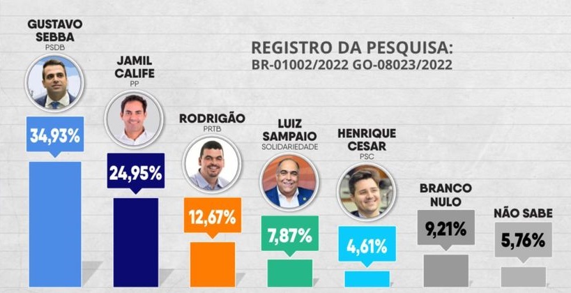 Levantamento Goiás Pesquisas/Mais Goiás realizado em Catalão, mostra o deputado estadual Gustavo Sebba (PSDB) 10% à frente do segundo colocado nas intenções de voto para a Assembleia Legislativa de Goiás (Alego). O tucano aparece com 34,93% contra 24,95% de Jamil Calife (PP).