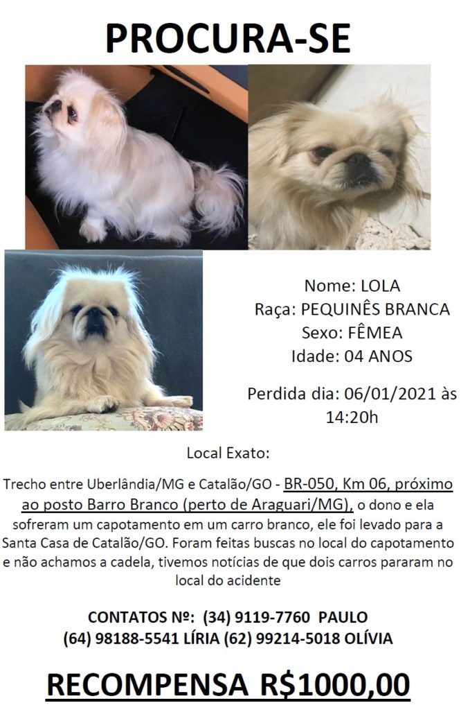 Durante um acidente ocorrido ontem, quarta-feira (06), na BR 050, entre as cidades mineira de Araguari e Uberlândia, próximo ao Posto Barro Branco, uma cadelinha da raça Pequinês Branca, que atende pelo no nome de Lola, a qual estava dentro do veículo, desapareceu.