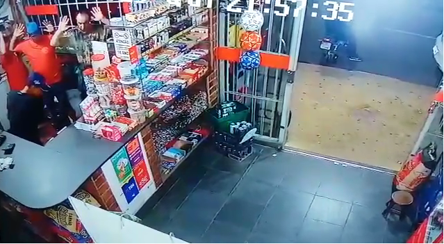 Na imagem captada por câmeras de monitoramento, mostra o proprietário e seus funcionários rendidos pelo assaltante, enquanto ele faz o limpa no caixa. Foto: Reprodução