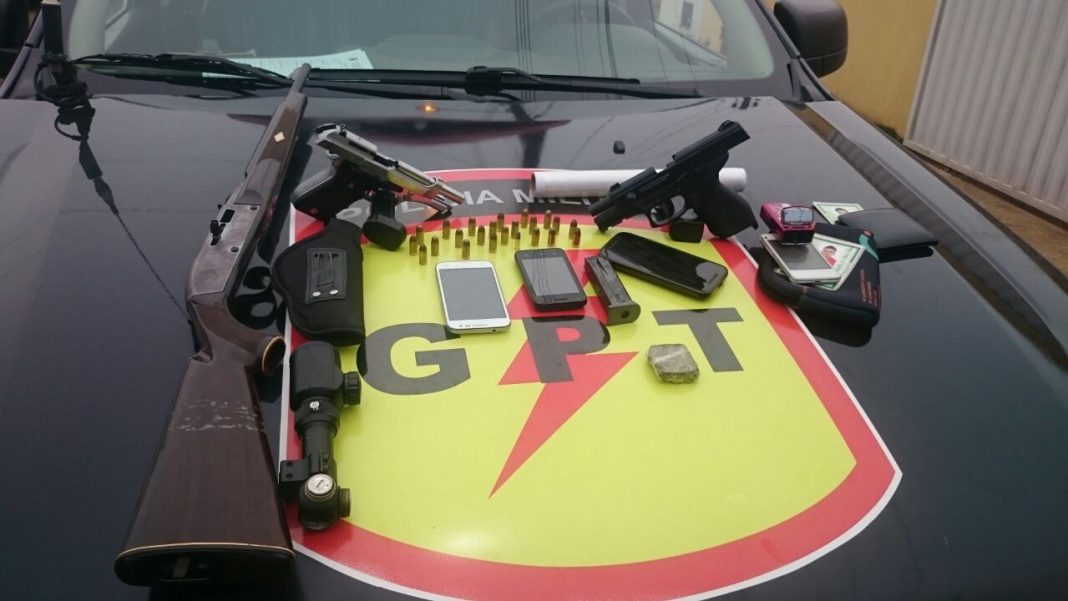 Uma espingardas calibre ponto 22 e uma pistola calibre ponto 380, ambas com a numeração raspada, foram apreendidas em poder de um jovem de 23 anos de idade e outro de 20 anos, os quais trafegavam em veículo em atitude suspeita no setor citado acima, quando foram abordados pelas viaturas da PM.