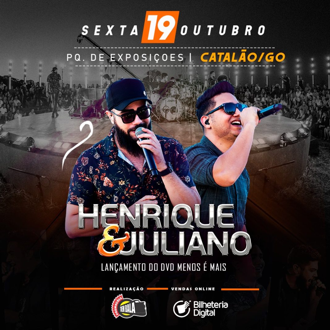 A empresa mineira de promoção de eventos, Trem Bala Promoções, a qual já promoveu vários eventos de sucesso em nossa cidade, promoverá show da dupla Henrique e Juliano, no dia 19 de outubro, no Parque de Exposições de Catalão, com o lançamento do trabalho dos sertanejos, o DVD Menos é Mais.