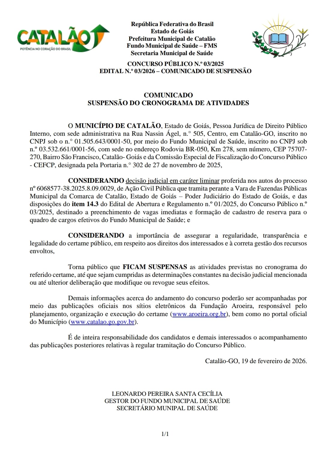 O Blog do Badiinho informou ainda mais cedo que a Prefeitura de Catalão suspenderia o concurso público da Saúde. Poucas horas depois, o município publicou a nota oficial e o edital que confirmam a paralisação do cronograma.