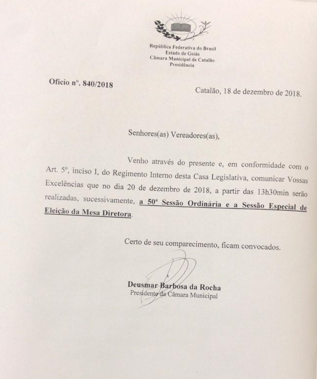 A presidência da Câmara Municipal de Catalão, emitiu um comunicado aos 17 vereadores de Catalão, informando que a eleição de escolha da nova mesa diretora será realizada na 50ª Sessão Ordinária, que será uma Sessão Especial de Eleição da Mesa Diretora, programada para acontecer na próxima quinta-feira, 20 de dezembro, às 13h30, mesmo dia em que o vereador e candidato a presidência da Câmara de Catalão, Helson Barbosa de Sousa “Caçula” (MDB), foi convidado a prestar depoimento na Delegacia Estadual de Repressão a Crimes Contra a Administração Pública (DERCAP), em Goiânia, às 14 horas, sobre o caso das cestas básicas que foram extraviadas da Prefeitura de Catalão, ocorridas no final do mês de setembro deste ano.