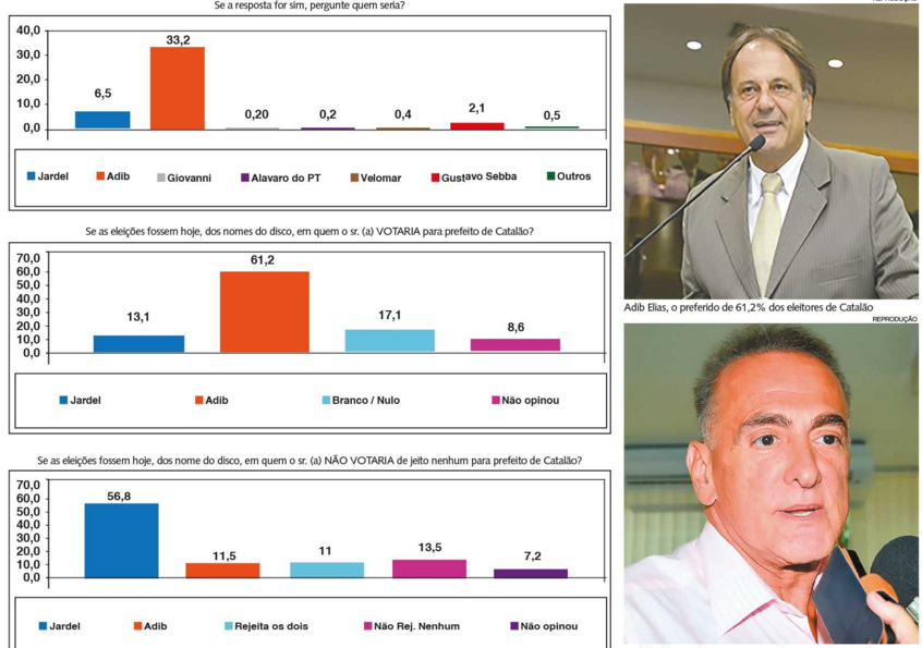 O deputado estadual Adib Elias (PMDB) é o preferido de 61,2% dos eleitores de Catalão para ser o próximo prefeito da cidade. É o que revela pesquisa de intenção de votos feita pelo Instituto EPB Consultoria Política e Econômica. A consulta ocorreu entre os dias 16 e 19 de janeiro e ouviu 720 eleitores distribuídos por 10 setores e bairros distribuídos pela cidade. A margem de erro da pesquisa é máxima de 3,6% para mais ou para menos e o nível de confiança é de 95%.