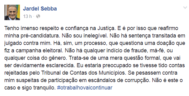 Com a condenação pelo órgão colegiado da Justiça Eleitoral (TRE/GO), Jardel Sebba (PSDB) ficou inelegível pelo prazo de 8 anos, ficando impedido de participar das eleições que ocorrerem nos próximos anos, nos termos da alínea “p”, da Lei da ficha Limpa (LC n 64/90). Assim diz parte do texto postado nas redes sociais.