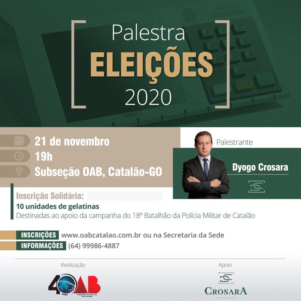 O advogado Dyogo Crosara ministrará palestra com o tema “Eleições 2020” hoje, quinta-feira, 21 de novembro, às 19h, na Subseção da OAB de Catalão (GO). O especialista falará sobre as leis eleitorais, as mudanças aprovadas recentemente, como o fim das coligações; os desafios da Justiça Eleitoral, principalmente, em relação à internet; o novo cenário de campanha para os candidatos, a distribuição de recursos para os partidos, entre outros assuntos.