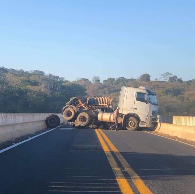 EM CALDAS NOVAS, CARRETA BATE EM PROTEÇÃO DE PONTE E RODOVIA FICA INTERDITADA