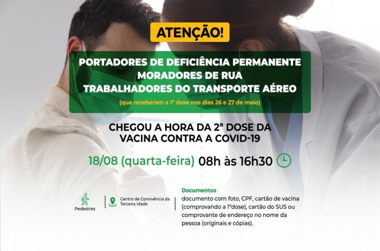 Os portadores de deficiência permanente, moradores de rua e trabalhadores do transporte aéreo que já receberam a primeira dose da vacina contra a covid-19 (AstraZeneca): a Prefeitura, por meio da Secretaria Municipal de Saúde, convoca para aplicação do reforço do imunizante. Será nesta quarta-feira, dia 18 de agosto.