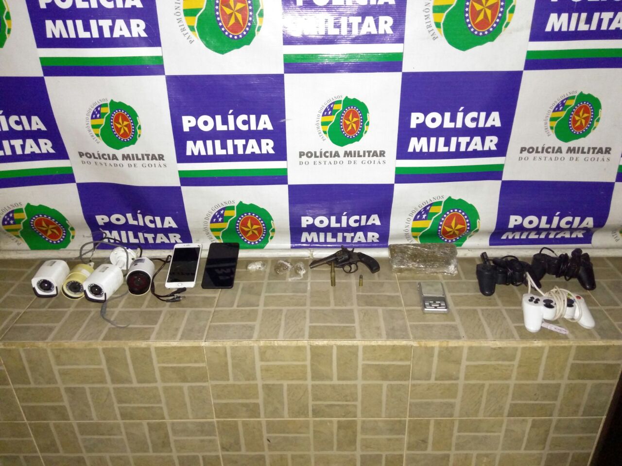 A Polícia Militar na noite da última terça (09), após receberem informações de que em uma residência no bairro Parque das Mangueiras na Cidade de Catalão estaria sendo utilizada para comercialização de substâncias entorpecentes, realizou um monitoramento pelo local onde suspeitos que estavam na parte externa de uma residência, ao perceberem a presença da equipe, saíram correndo adentrando na residência. A PM realizou um cerco onde dois suspeitos foram abordados no local e, durante as buscas na residência, foram encontrados um revólver e uma munição calibre .32, uma munição calibre 7,62, porções de substâncias aparentando maconha, balança de precisão, plástico insulfilme e vários objetos sem procedência.