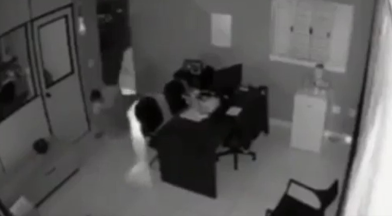 Ao ser surpreendido pelo suspeito revirando a mesa de uma sala, o dono da loja atira no homem. Depois, outro homem também aparece armado por outra porta.