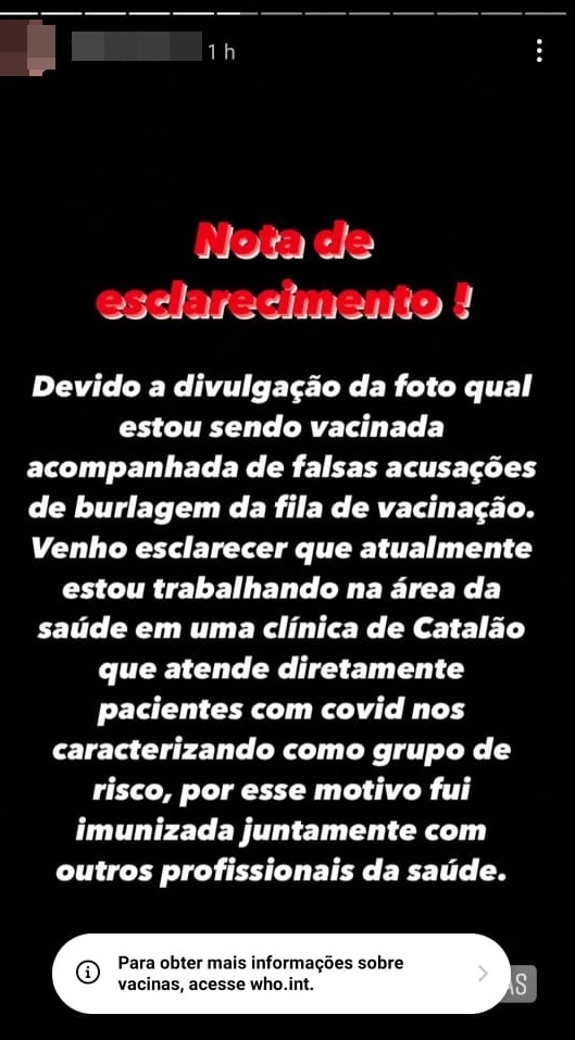 No mesmo das postagens no stories de sua conta no Instagram, após a grande repercussão, a moça fez uma publicação de uma nota de esclarecimento, afirmando que são falsas as acusações contra ela, esclarecendo que ela atualmente está trabalhando na área da saúde em uma clínica da cidade, a qual atende diretamente pacientes com Covid-10, o que a caracteriza como grupo, e por esse motivo é que ela teria sido imunizada juntamente com outros profissionais da saúde. Leia abaixo a nota na íntegra: