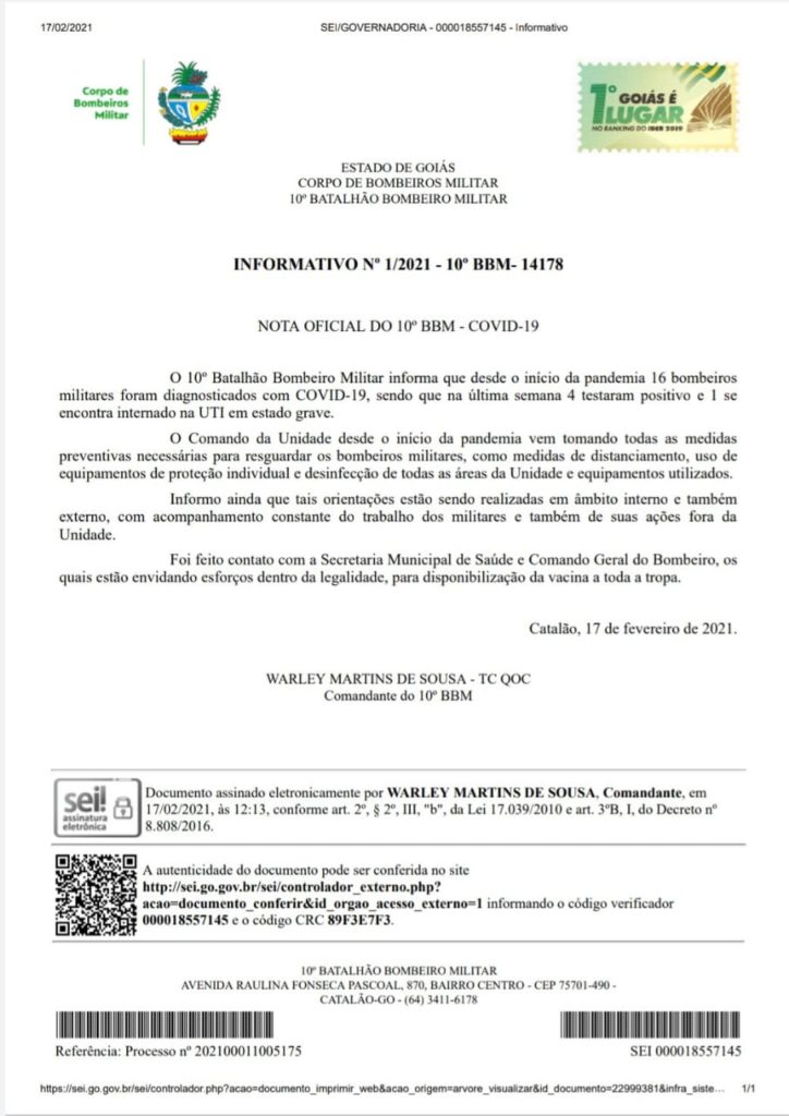 A nota ainda afirma que na última semana, um total de quatro militares da corporação do 10º BBM de Catalão, receberem resultados positivos para a contaminação do vírus, sendo que um deles, um tenente de 42 anos de idade, encontra-se internado em Unidade de Terapia Intensiva (UTI) em estado grave. A internação do tenente aconteceu no dia 12 de fevereiro, em hospital particular da cidade.