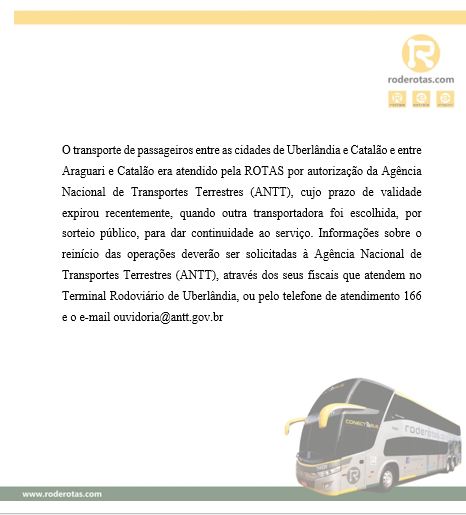 A empresa Rotas, que realizava o transporte de passageiros na linha Catalão/Uberlândia, entrou em contato com a redação do Blog do Badiinho na tarde de hoje, quarta-feira (30), onde em nota afirma que o prazo de validade da autorização expedido pela Agência Nacional de Transportes Terrestres (ANTT) expirou-se recentemente, e que outra empresa foi escolhida por meio de sorteio público.