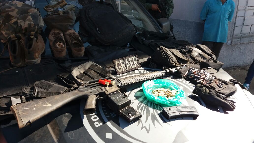 Hoje pela manhã, policiais do GRAER apresentaram alguns objetos apreendidos durante as buscas a quadrilha especializada em roubos a bancos. Entre os objetos apreendidos estavam uma submetralhadora 9mm, pistolas calibre 380 e ponto 45, espingardas, coletes a prova de bala e luvas.
