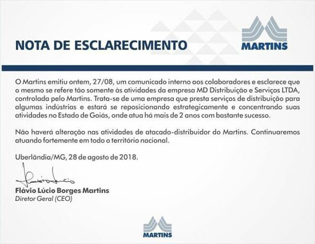Em contato com a nossa redação, a assessoria do grupo explicou que a nota emitida pelo diretor da empresa, Senhor Flávio Borges, teria sido mal interpretada, esclarecendo que será transferido para Goiás apenas às atividades da empresa MD Distribuidora e Serviços LTDA, a qual é controlada pelo Grupo Martins.
