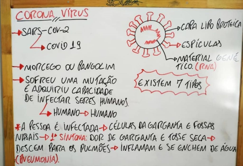 O professor Diogo Neves, do CEPI Maria Antonieta, também aproveitou o período para inserir a temática do coronavírus (Covid-19) em suas aulas de biologia. Por meio de uma live no Instagram, ele ministrou uma aula sobre a estrutura do vírus e as principais informações sobre a doença por ele transmitida. Após a aula, os estudantes desenvolveram esquemas sobre o conteúdo apresentado, compartilhando aquilo que aprenderam.