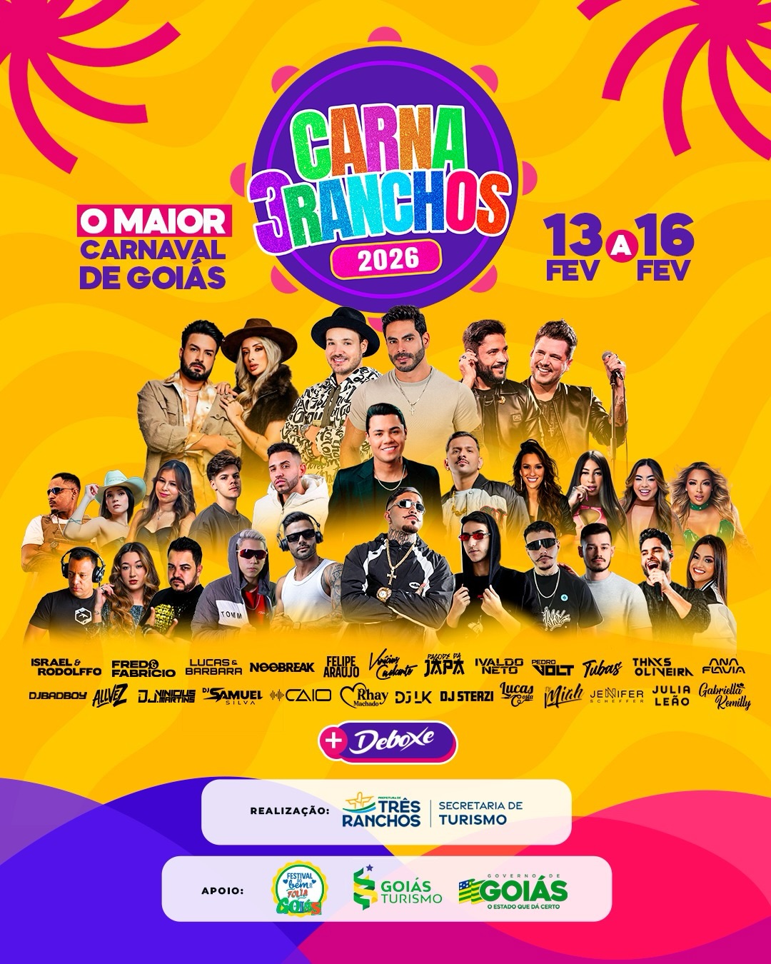 O Carna Três Ranchos 2026 acontece de 13 a 16 de fevereiro. Com isso, a cidade se prepara para quatro dias de festa gratuita. Além disso, a programação reúne grandes atrações nacionais, artistas regionais e DJs.