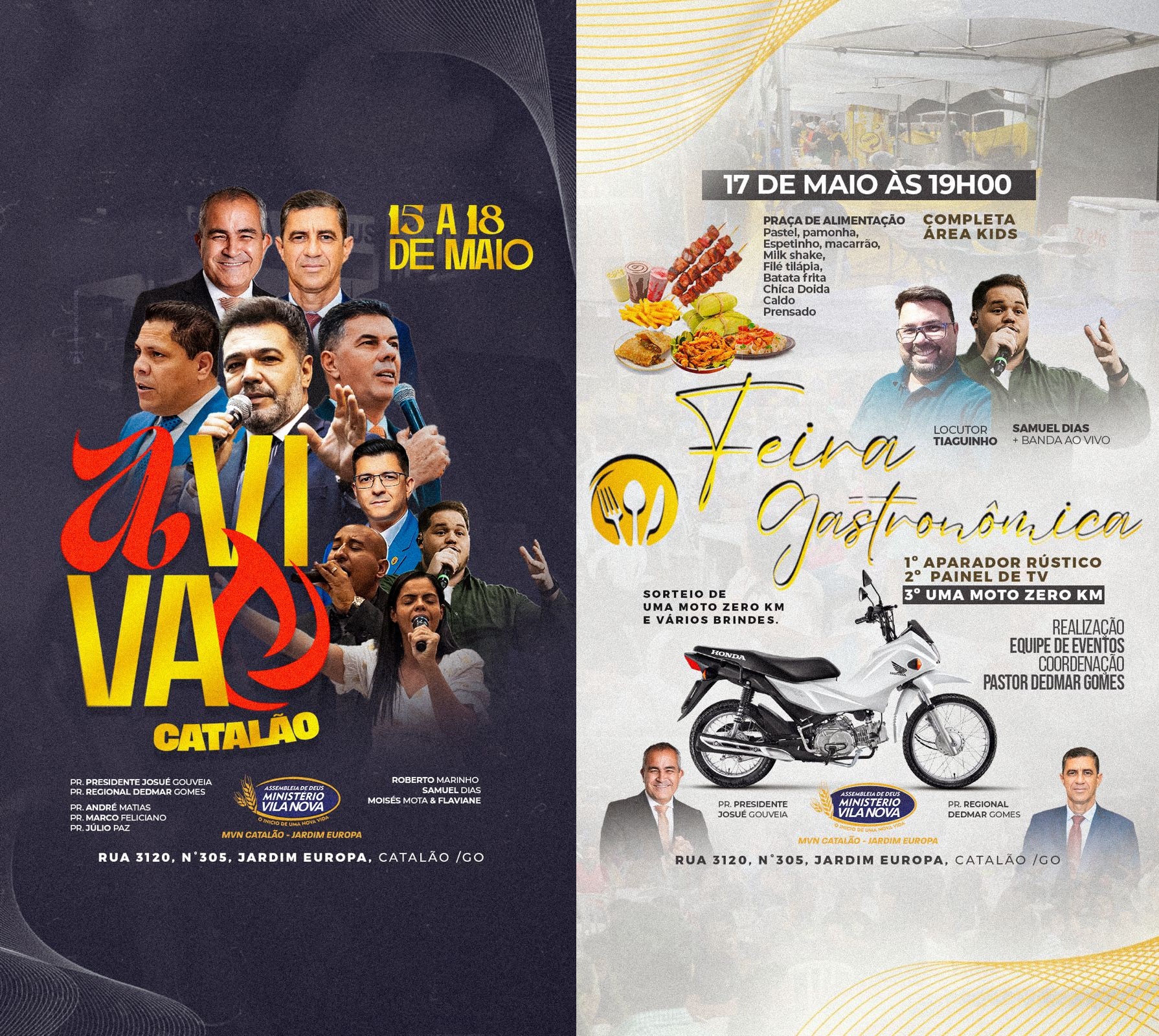 Catalão se prepara para sediar um dos maiores eventos evangélicos do estado. Entre hoje, quinta-feira (15) e 18 de maio, a Assembleia de Deus Ministério Vila Nova realiza o “A Viva Catalão”. A programação será intensa, com cruzadas evangelísticas, shows gospel, feira gastronômica, sorteios e estrutura voltada para toda a família.