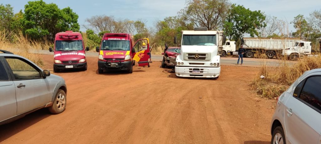 Na manhã desta quarta-feira (29), por volta das 09hrs, um grave acidente envolvendo um veículo de passeio e um caminhão, deixou três pessoas feridas.