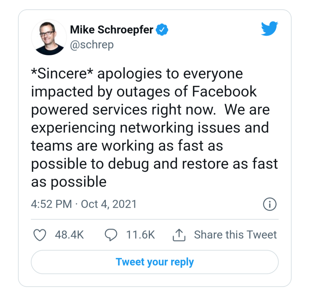 A mensagem foi postada no Twitter pelo diretor de tecnologia da empresa (CTO, na sigla em inglês), Mike Schroepfer. O Facebook também é o dono do WhatsApp e do Instagram.