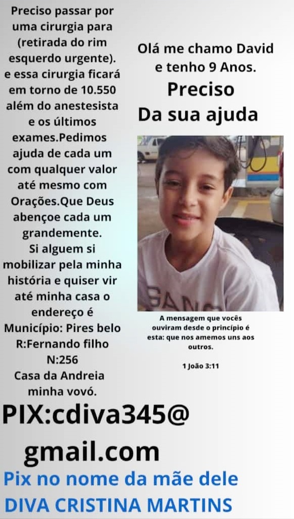 Familiares do pequeno Davi Gabriel Cândido Martins, de apenas 9 anos de idade, estão realizando uma campanha na internet para conseguir a quantia de R$ 10.500.00 para o procedimento de retirada do rim esquerdo.