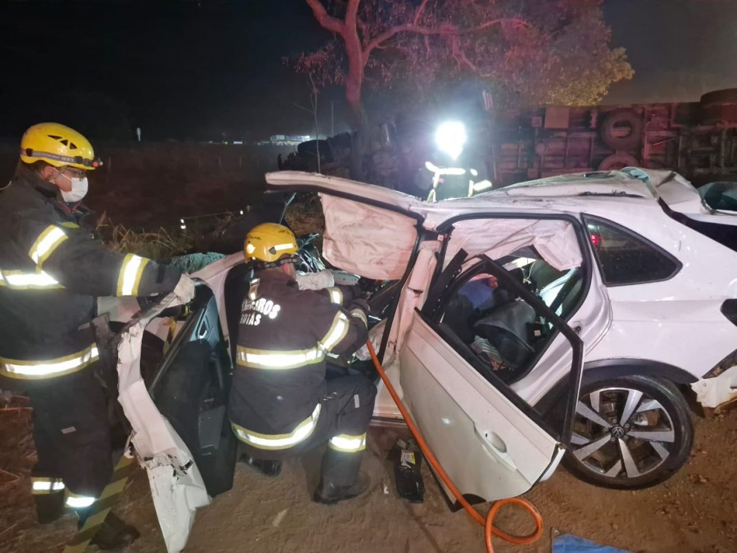 O choque lançou os passageiros do banco traseiro para fora do carro. Logo depois, o caminhão atingiu uma motocicleta e tombou na rodovia. O motociclista e a passageira morreram na hora, enquanto o caminhoneiro sofreu apenas ferimentos leves e recebeu atendimento no Hospital Municipal de Campinorte.