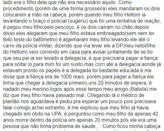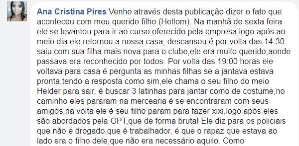 “Eles pararam para fazer xixi de madrugada e foram abordados pela GPT. Eles mandaram o menino embora e colocaram o Heltom no camburão por estar bêbado. Algum tempo depois ligaram para avisar que ele sofreu um infarto fulminante”, assim disse um familiar do homem.