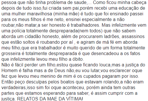 Ontem, domingo, 11 de março, o Blog do Badiinho publicou matéria sobre o caso, e em um curto espaço de tempo centenas de pessoas comentaram no link da matéria, os quais a maioria dos que interagiram na publicação, cobram rigor nas investigações sobre o caso. Em um dos comentários, uma pessoa amiga da família publicou um depoimento, onde afirma ser a mãe de Heltom Rita a autora das declarações.
