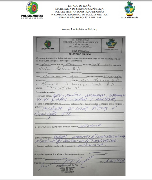 De acordo com familiares, o Sr Helton era acometido de hipertensão arterial. Conforme relatório médico anexo emitido pelo Dr.Michel Henrique F. Santa Cruz (CRM-GO 12.541) a morte ocorreu por causas naturais, a saber, parada cardíaca. Portanto, aprincípio, não houve nexo causal entre a ação policial militar, executada em conformidade com a legislação vigente, e o lamentável falecimento do Sr. Helton Antônio Rita. Não obstante, será instaurado Inquérito Policial Militar para apurar o caso. O 18º Batalhão de Polícia Militar está à disposição dos familiares.
