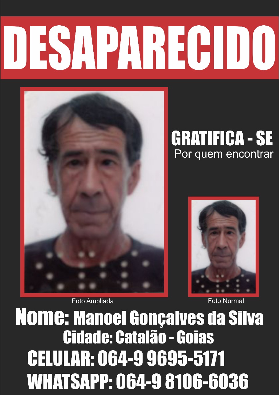 Manoel Gonçalves da Silva, está desaparecido desde às 14 horas da última sexta-feira (11), às 14Hs. O Senhor Manoel é portador de deficiência mental e visual. Caso alguém tiver informações sobre ele, por favor entrar em contato com Simone imediatamente, pois os familiares estão angustiados e querem o encontrá-lo o mais rápido possível.