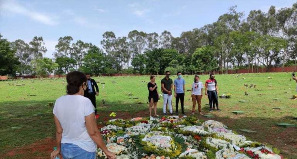 Sobre o túmulo de Marília Mendonça, muitas coroas de flores foram colocadas por artistas. Uma delas tinha formato de violão, instrumento que a cantora tocava.