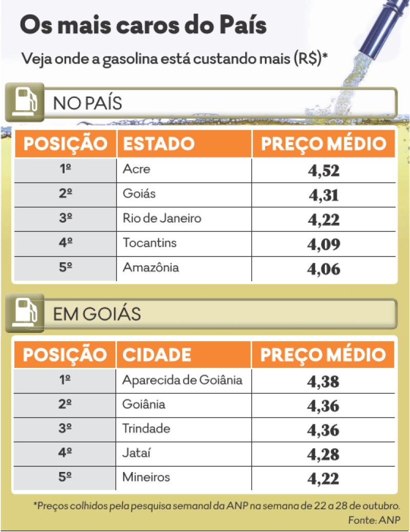 O preço médio da gasolina vendida em Goiás foi o segundo maior do País na semana passada, segundo a pesquisa semanal de preços feita pela Agência Nacional do Petróleo (ANP) em todo o País. Em média, o goiano pagou R$ 4,31 pelo litro do combustível, valor menor apenas desembolsado no Acre, onde a gasolina foi vendida por R$ 4,52. A partir desta quarta-feira (1º), a pauta da gasolina (valor de referência para o cálculo de ICMS no Estado) também subirá de R$ 3,90 para R$ 4,16, o que pode pressionar ainda mais os preços.