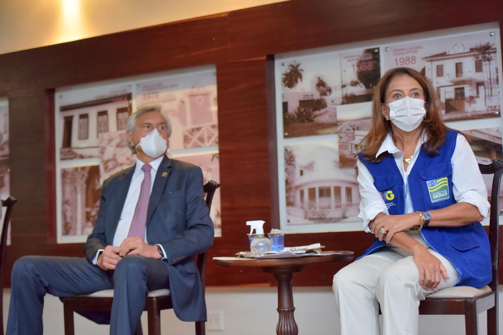 O governador Ronaldo Caiado, ao lado da presidente de honra da OVG e coordenadora do Gabinete de Políticas Sociais (GPS), primeira-dama Gracinha Caiado, durante lançamento do Programa Universitário do Bem (ProBem), que beneficiará estudantes com bolsas de 50% e 100% do valor da mensalidade. Foto: Hegon Corrêa.