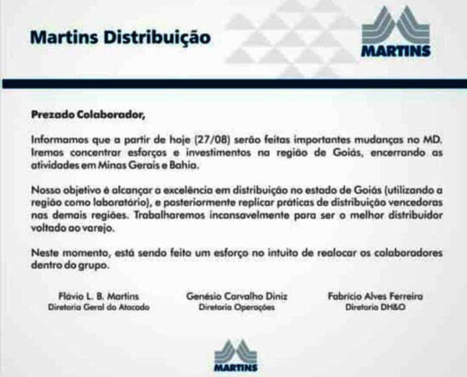 O Grupo Martins, referência em distribuição e varejo no Brasil, anunciou através de uma nota emitida no última dia 28 de agosto, que encerrou suas atividades nos Estados de Minas Gerais e Bahia, e que o objetivo a partir de agora é alcançar a excelência em distribuição no Estado de Goiás, utilizando a região como laboratório, e posteriormente replicar as práticas de distribuição nas demais regiões, ou seja, passando a concentrar todas as suas atividades em Goiás. Leia o comunicado abaixo: