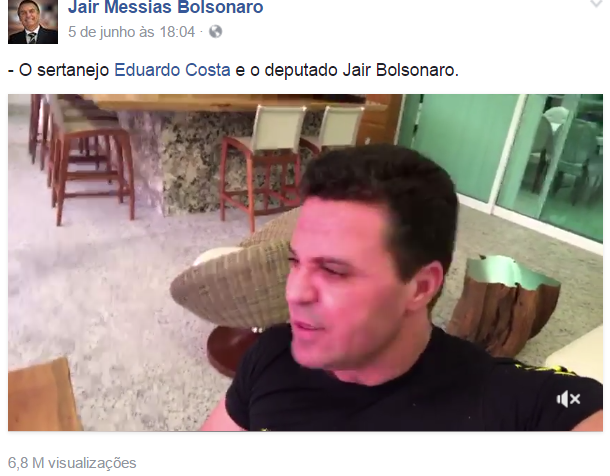 O deputado federal e pré-candidato a Presidente da República, Jair Messias Bolsonaro (PSC), publicou em sua conta no Facebook na última segunda-feira (05), um vídeo do cantor sertanejo Eduardo Costa, declarando apoio ao político e que é a favor da militarização de todas as escolas do país.