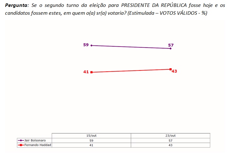 Em nova pesquisa realizada pelo IBOPE Inteligência a pedido da TV Globo e do jornal O Estado de S. Paulo, Jair Bolsonaro (PSL) segue à frente no segundo turno da disputa pela Presidência da República com 57% dos votos válidos (tinha 59%), enquanto Fernando Haddad atinge 43% (eram 41%). O percentual de votos válidos de cada candidato corresponde à proporção de votos do candidato sobre o total de votos, excluídos os votos brancos, nulos e indecisos.